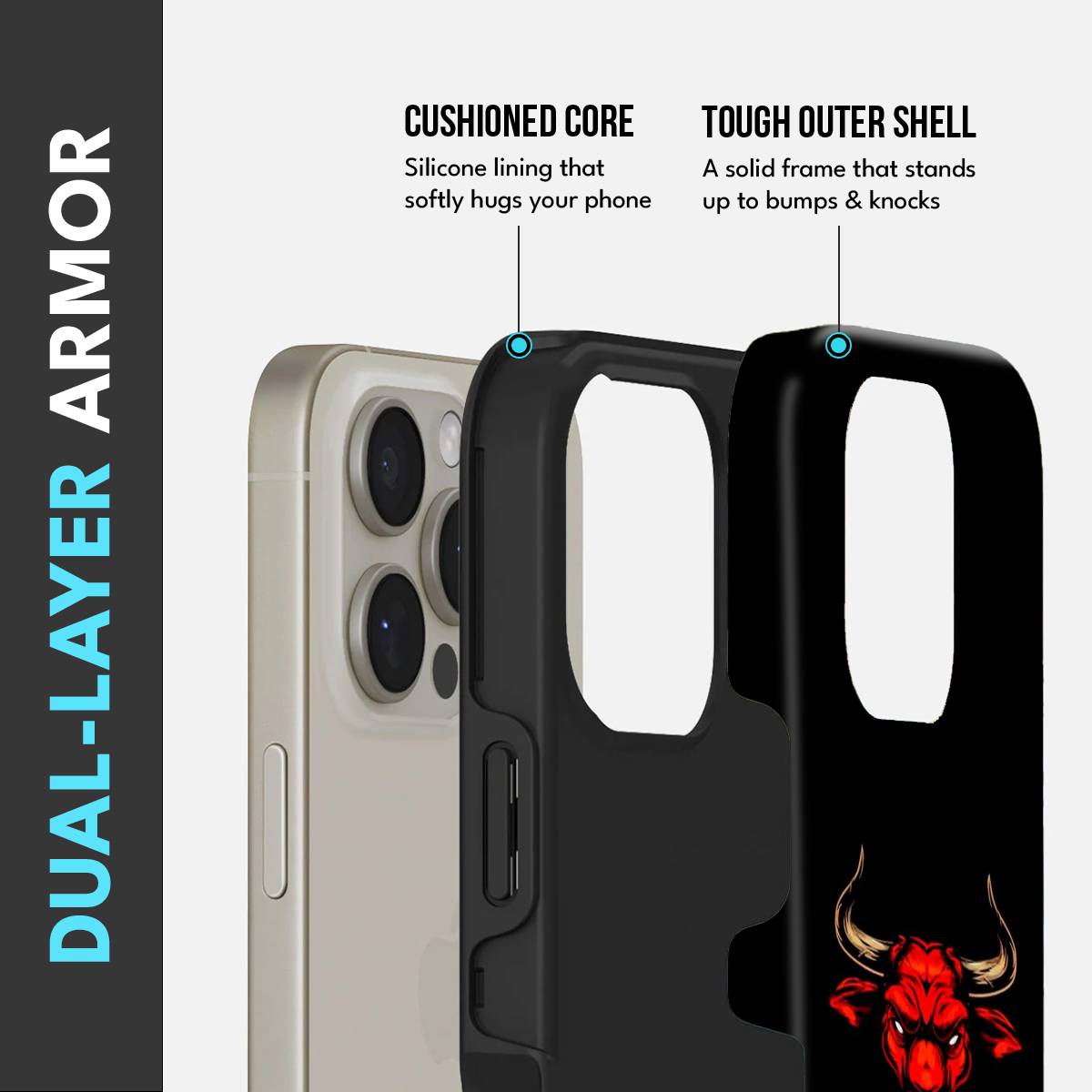 Unleash raw power and fearless style with the Bullstorm phone case. Featuring a fierce, blazing-red bull head illustrated with bold detail, this case embodies strength, determination, and unstoppable energy. The deep black background amplifies the fiery artwork, giving your phone a striking and fearless look from every angle.