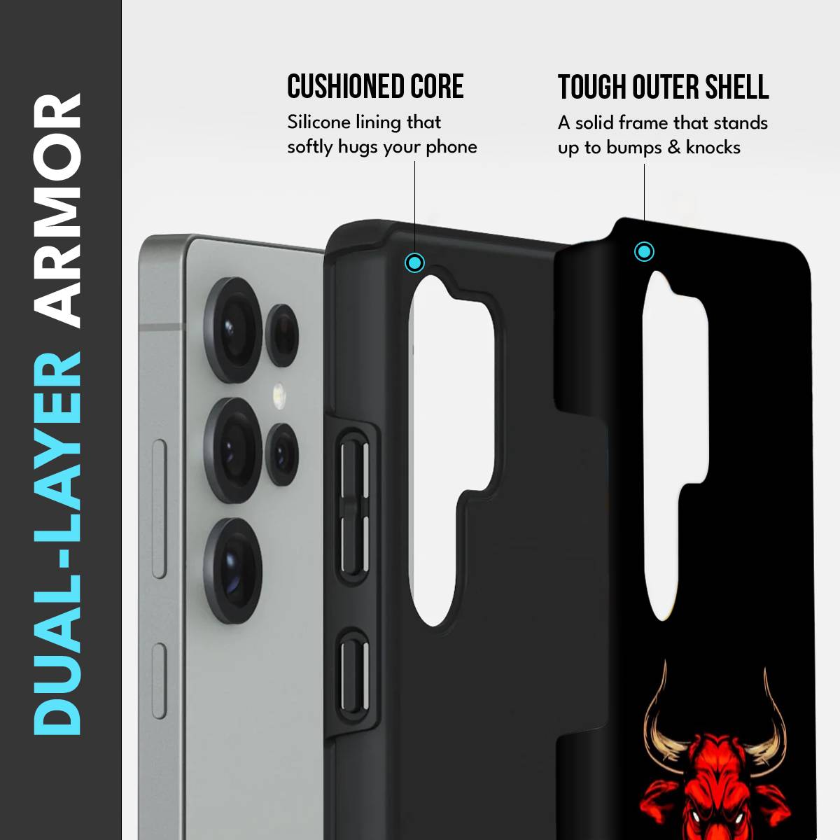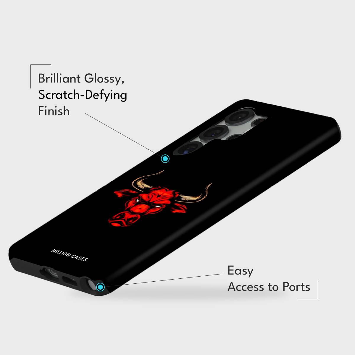 Unleash raw power and fearless style with the Bullstorm phone case. Featuring a fierce, blazing-red bull head illustrated with bold detail, this case embodies strength, determination, and unstoppable energy. The deep black background amplifies the fiery artwork, giving your phone a striking and fearless look from every angle.