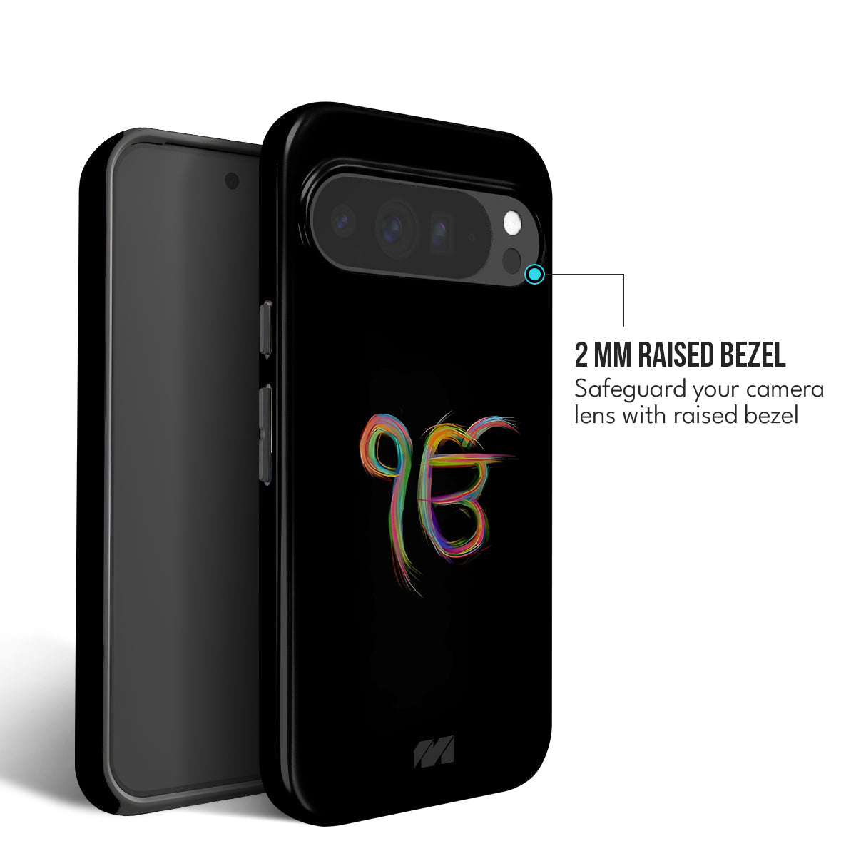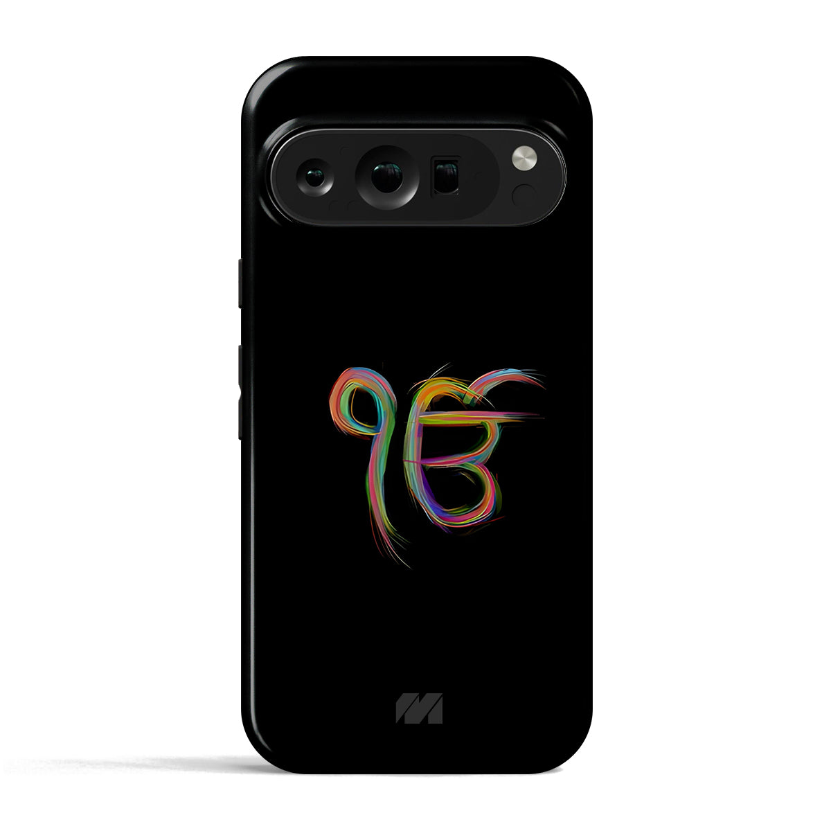 The Cosmic Ik Onkaar Case blends spiritual depth with modern artistic brilliance. Featuring a vibrant, multi-colored Ik Onkaar symbol glowing against a deep black background, this design represents unity, oneness, and cosmic harmony.