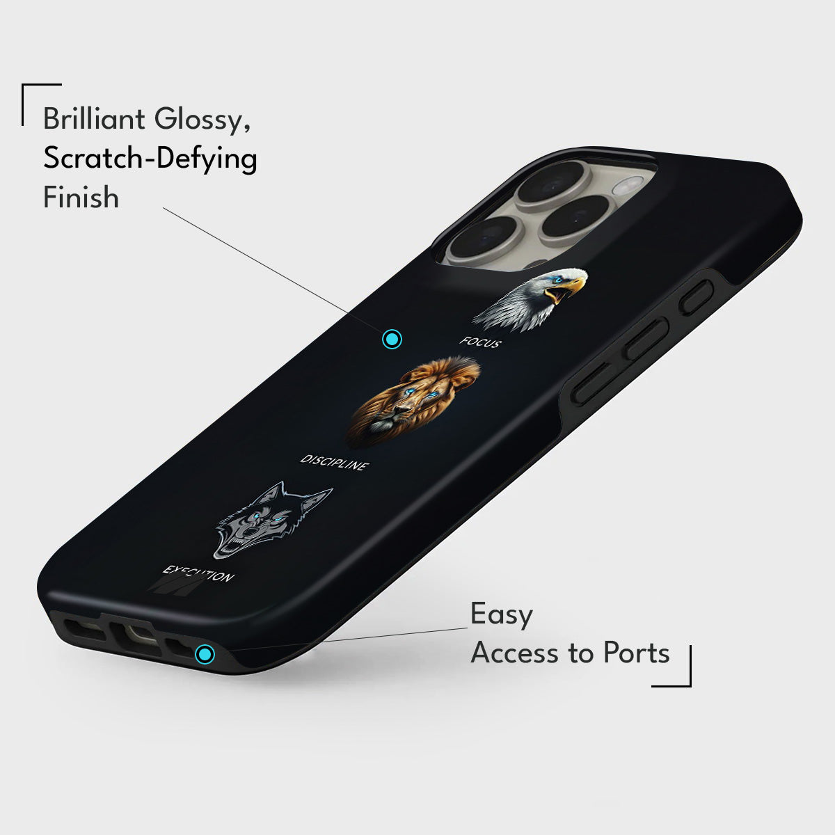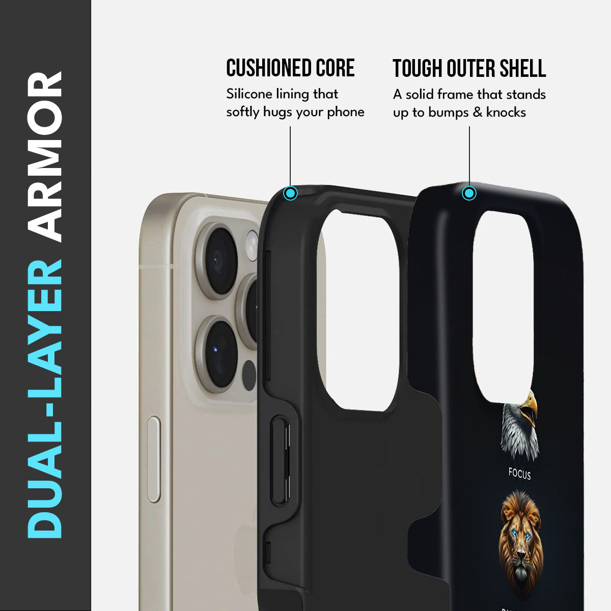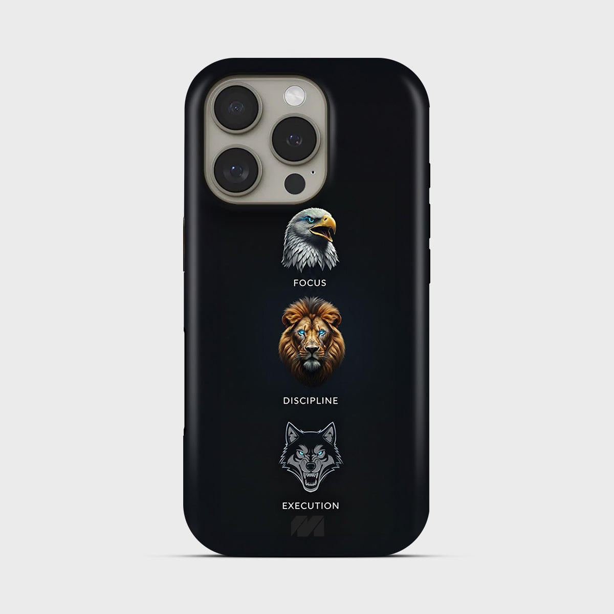 Channel the mindset of champions with the Focus Discipline Execution Case — a design crafted for those who refuse to settle for average. Featuring the fierce trio of an eagle, lion, and wolf, this case symbolizes the core pillars of success: razor-sharp focus, unwavering discipline, and relentless execution.