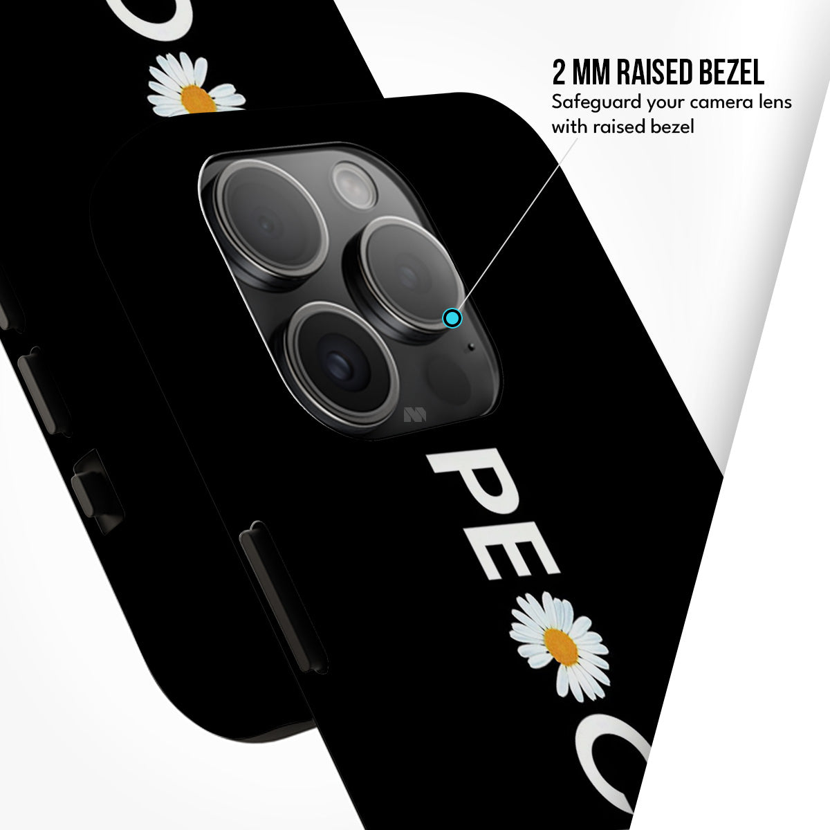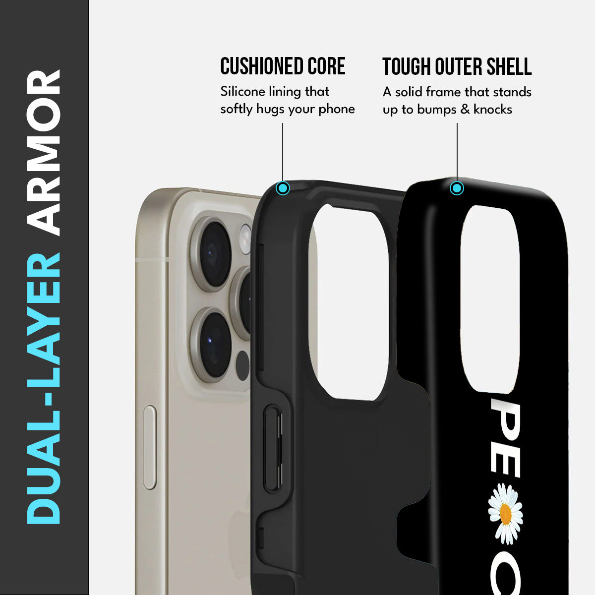Bring calm, clarity, and charm to your everyday life with the Harmony Flower phone case. Designed with a sleek black backdrop and a delicate daisy replacing the “O” in PEACE, this case blends minimalism with a meaningful message. It’s perfect for anyone who loves simple aesthetics with a touch of positivity.