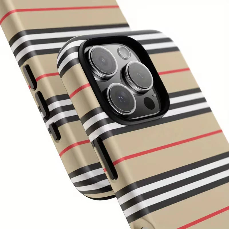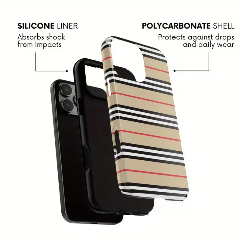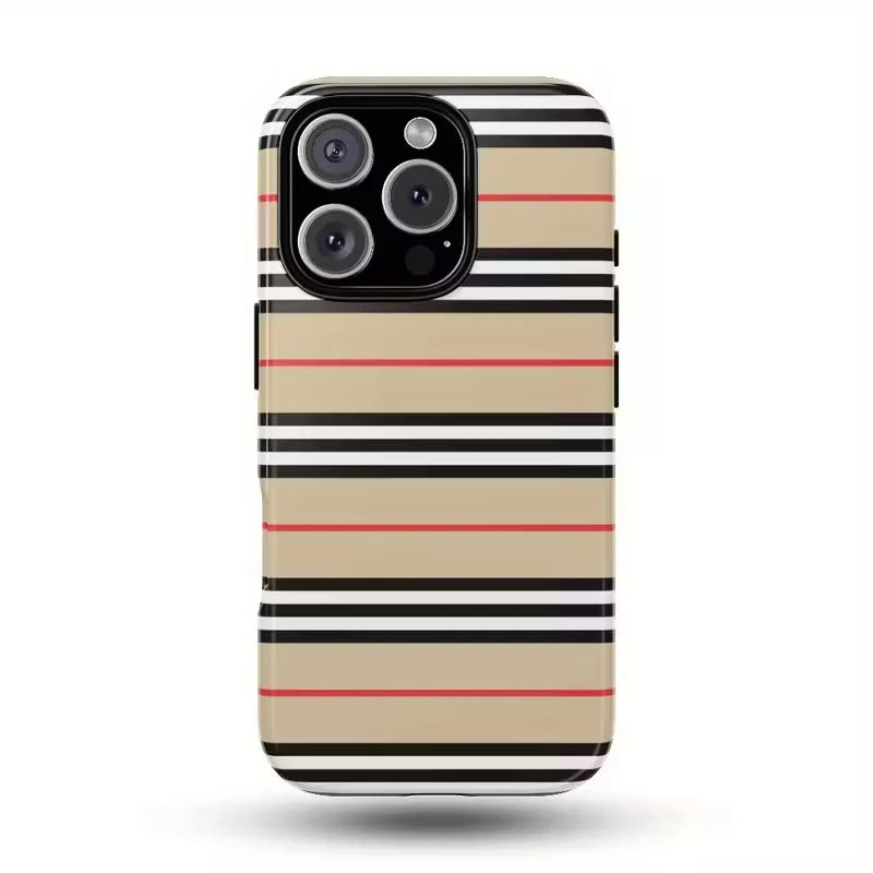 Elevate your style with the Heritage Lines case — a modern tribute to timeless fashion. Featuring a classic beige base adorned with bold black, white, and subtle red stripes, this design brings elegance and sophistication to your everyday carry.