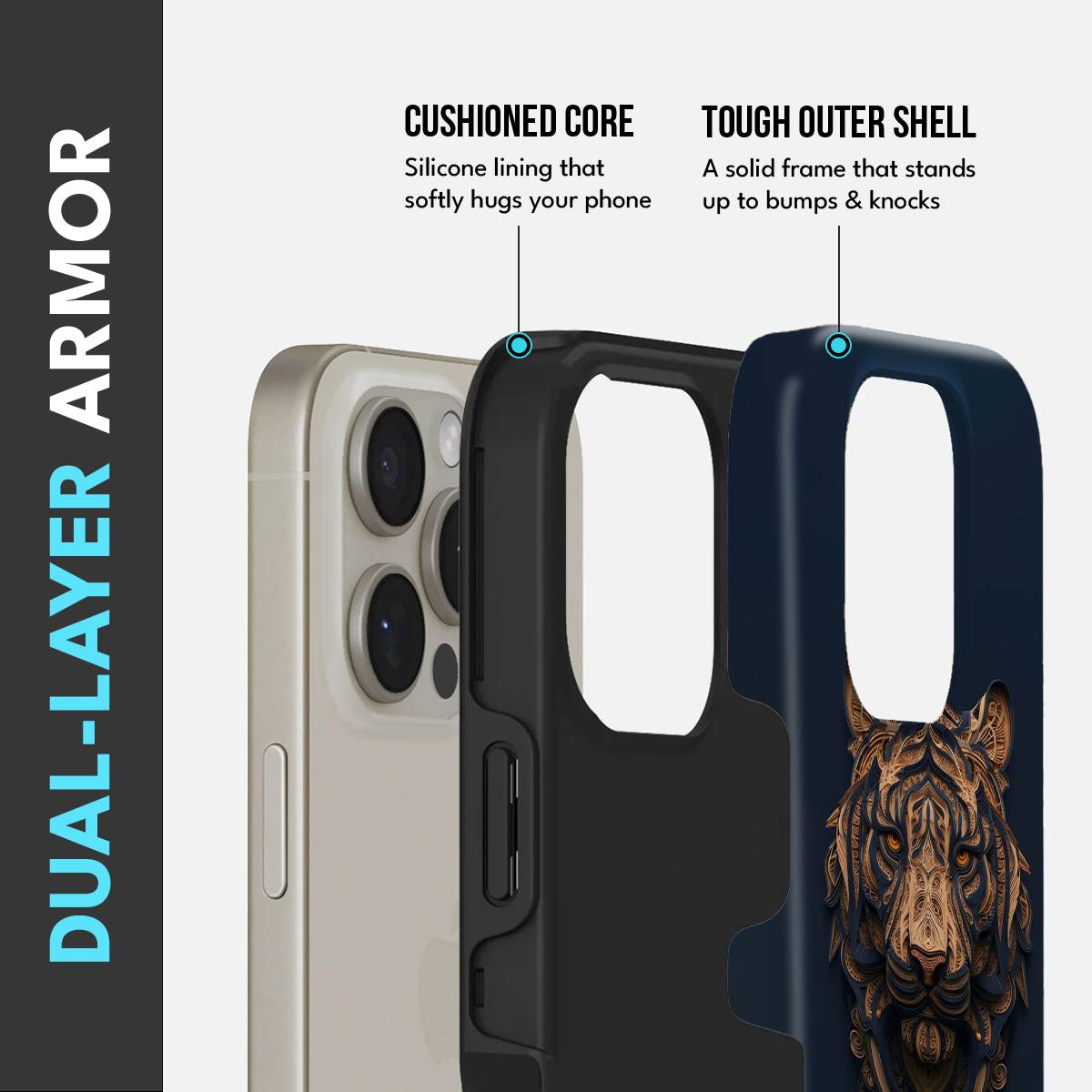 • Dual-Layer Protection: The phone case features silicon cushioning inside and a durable PC exterior outside.