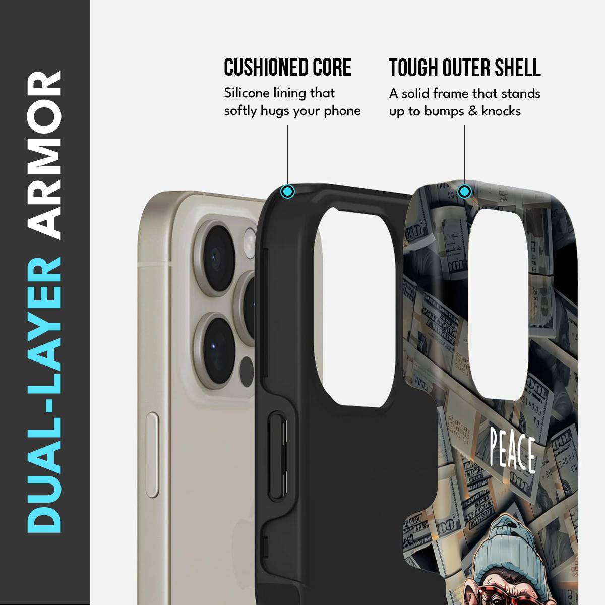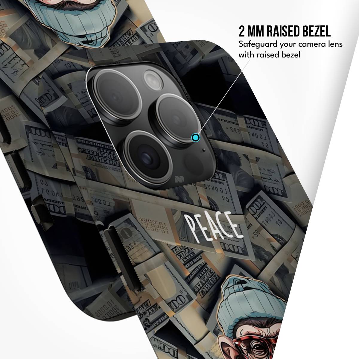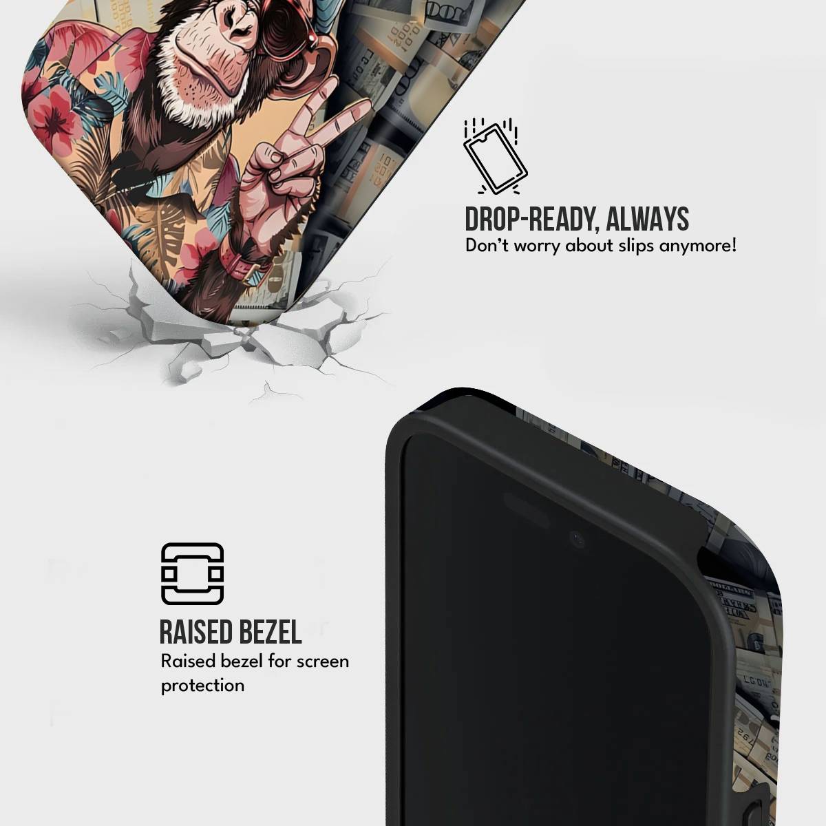 Bring bold energy and street-art swagger to your phone with the Hustle Ape Case—a design made for those who grind hard, live loud, and stay unbothered. Featuring a stylish, chilled-out ape in sunglasses and a floral shirt flashing the peace sign against a backdrop of stacked cash, this case captures the perfect mix of hustle and vibe.