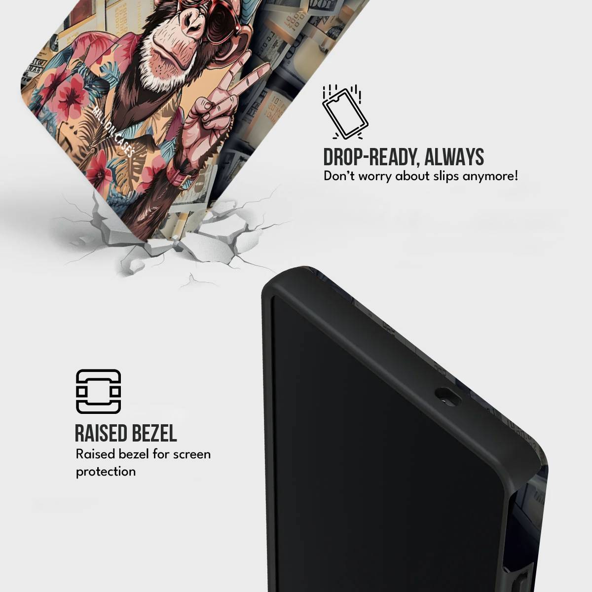 Bring bold energy and street-art swagger to your phone with the Hustle Ape Case—a design made for those who grind hard, live loud, and stay unbothered. Featuring a stylish, chilled-out ape in sunglasses and a floral shirt flashing the peace sign against a backdrop of stacked cash, this case captures the perfect mix of hustle and vibe.