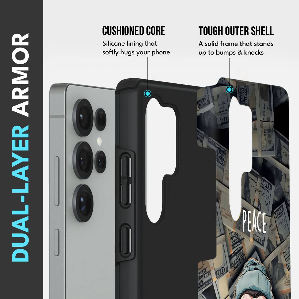 • Dual-Layer Protection: The phone case features silicon cushioning inside and a durable PC exterior outside.