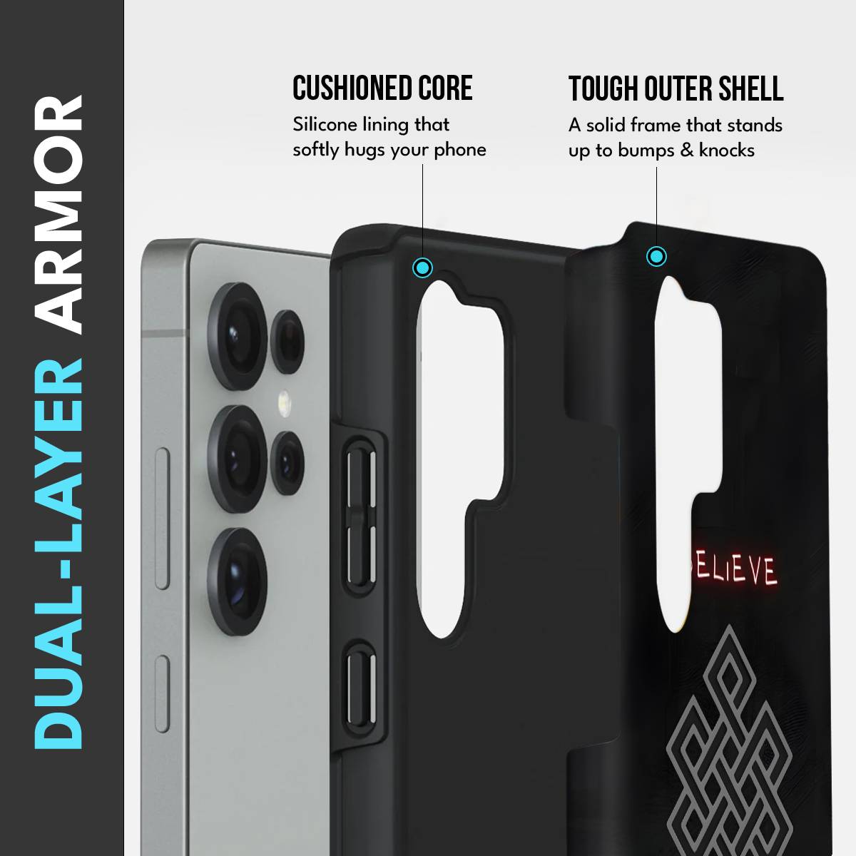 Karma Weave brings a powerful fusion of symbolism and style to your device. Designed with a striking eternal-knot motif and glowing text accents, this case represents connection, destiny, and the flow of energy through life. The deep black backdrop enhances the intricate weave pattern, making it stand out with a bold yet spiritual presence.