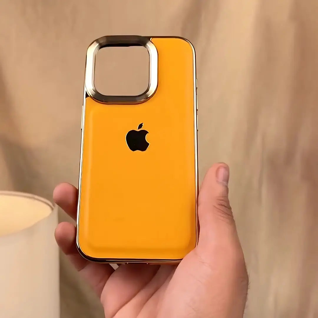 Blending bold color with sleek luxury, this leather case is defined by its metallic camera bezel and shimmering edge trim. Minimal in build, maximal in elegance—crafted for timeless impressions.