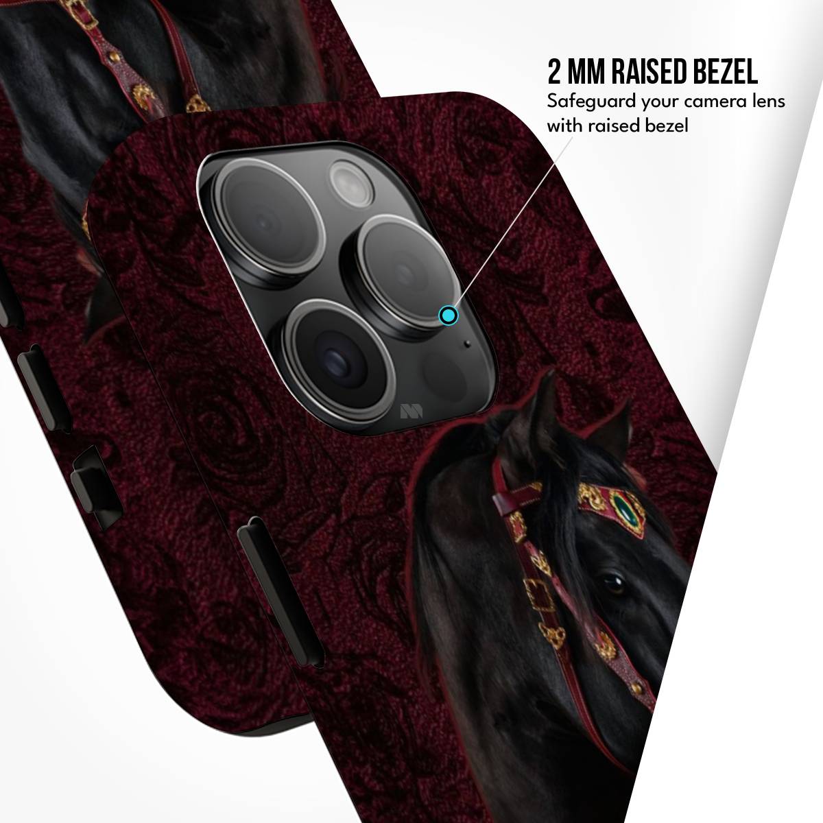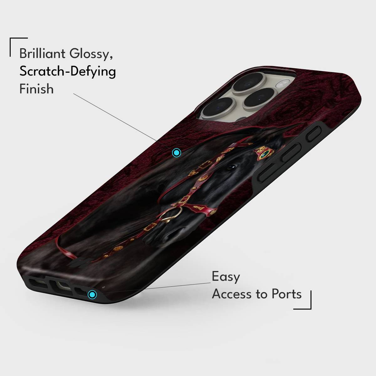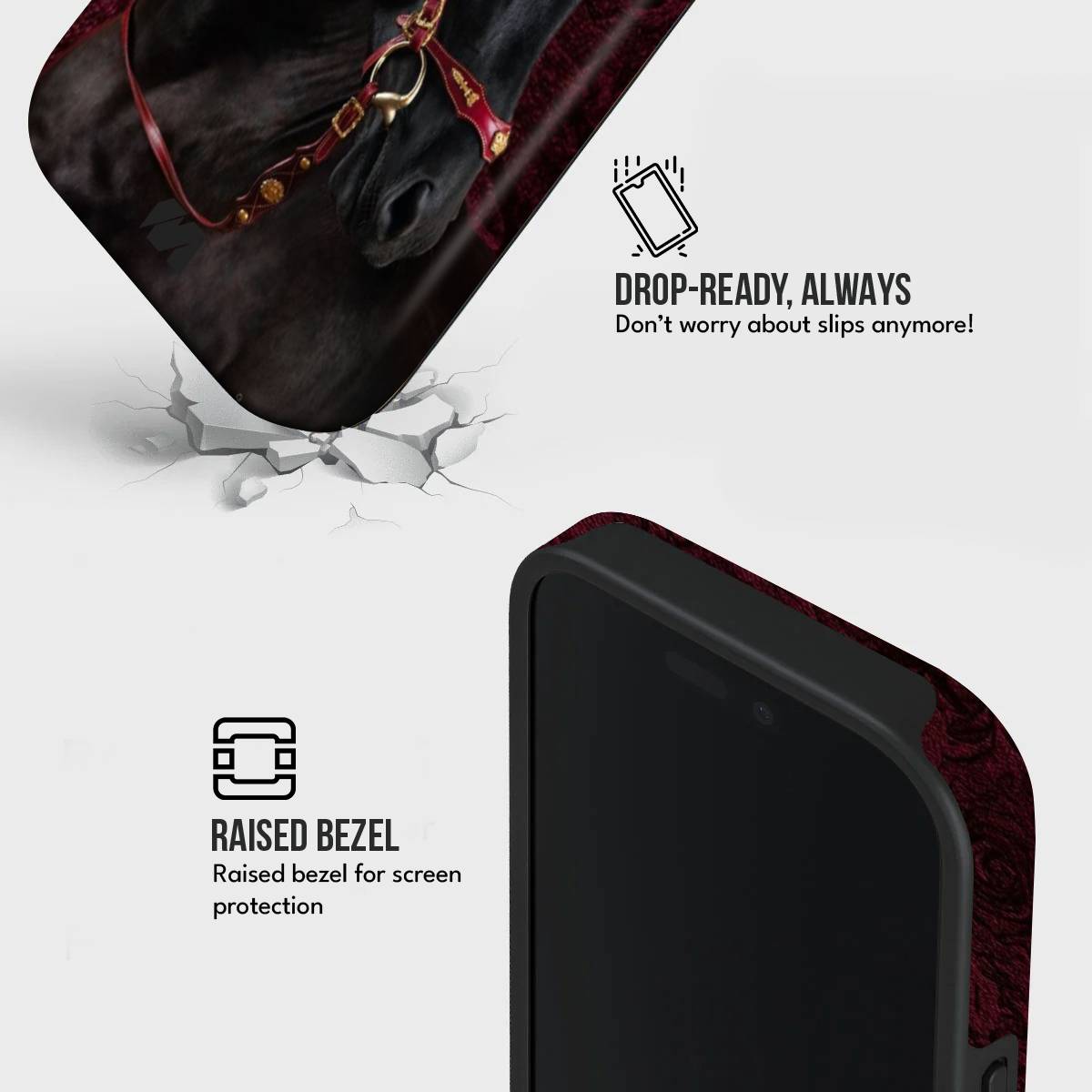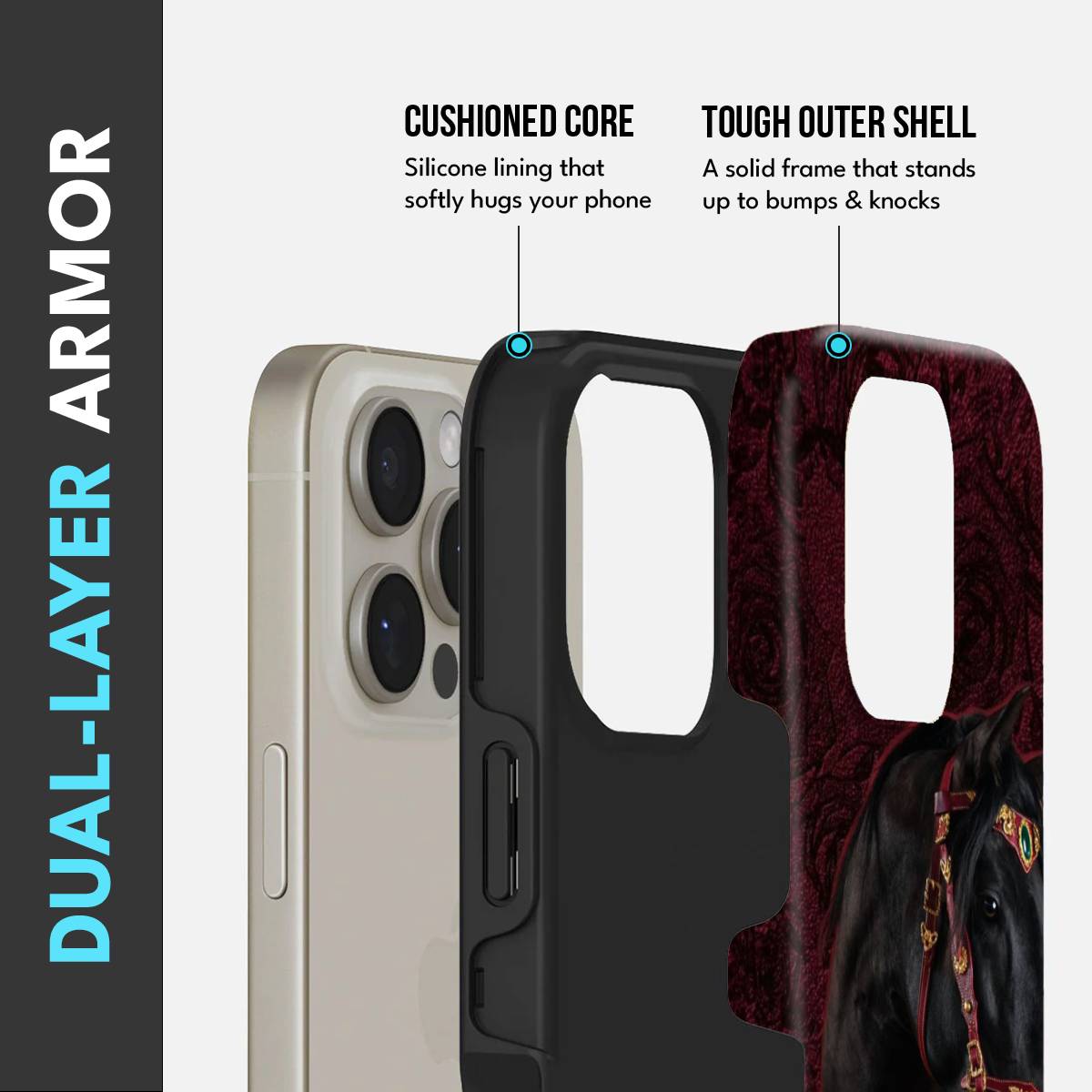 Elegance, power, and royalty come together in the Noble Steed phone case. Featuring a majestic black horse adorned with ornate gold and ruby-toned accessories, this design embodies sophistication and strength. The deep maroon textured backdrop adds a luxurious touch, making your device feel like a statement piece inspired by heritage and nobility.