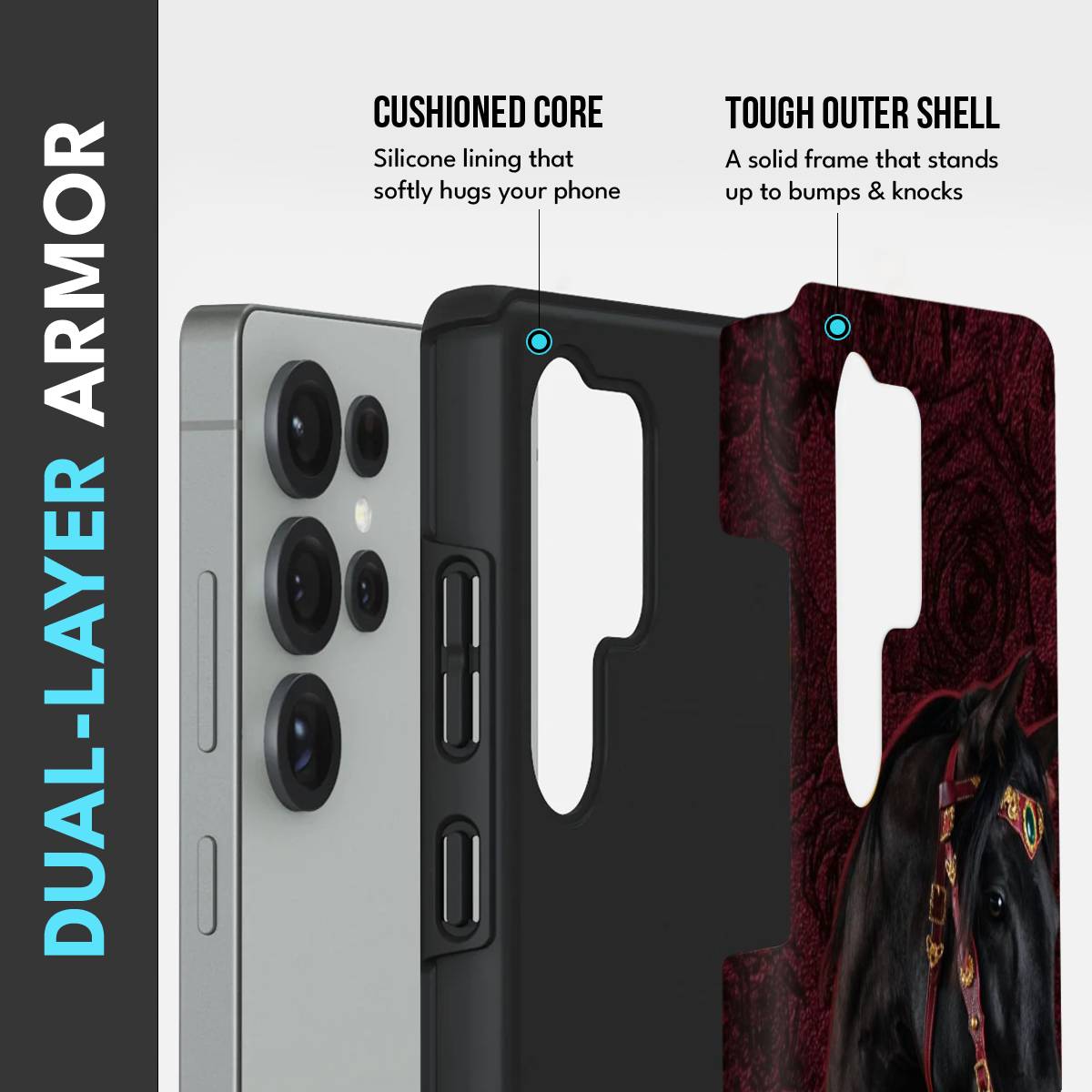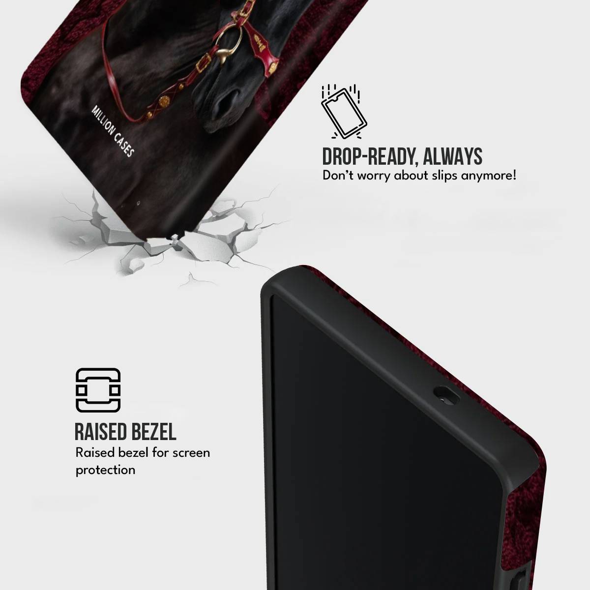 Elegance, power, and royalty come together in the Noble Steed phone case. Featuring a majestic black horse adorned with ornate gold and ruby-toned accessories, this design embodies sophistication and strength. The deep maroon textured backdrop adds a luxurious touch, making your device feel like a statement piece inspired by heritage and nobility.