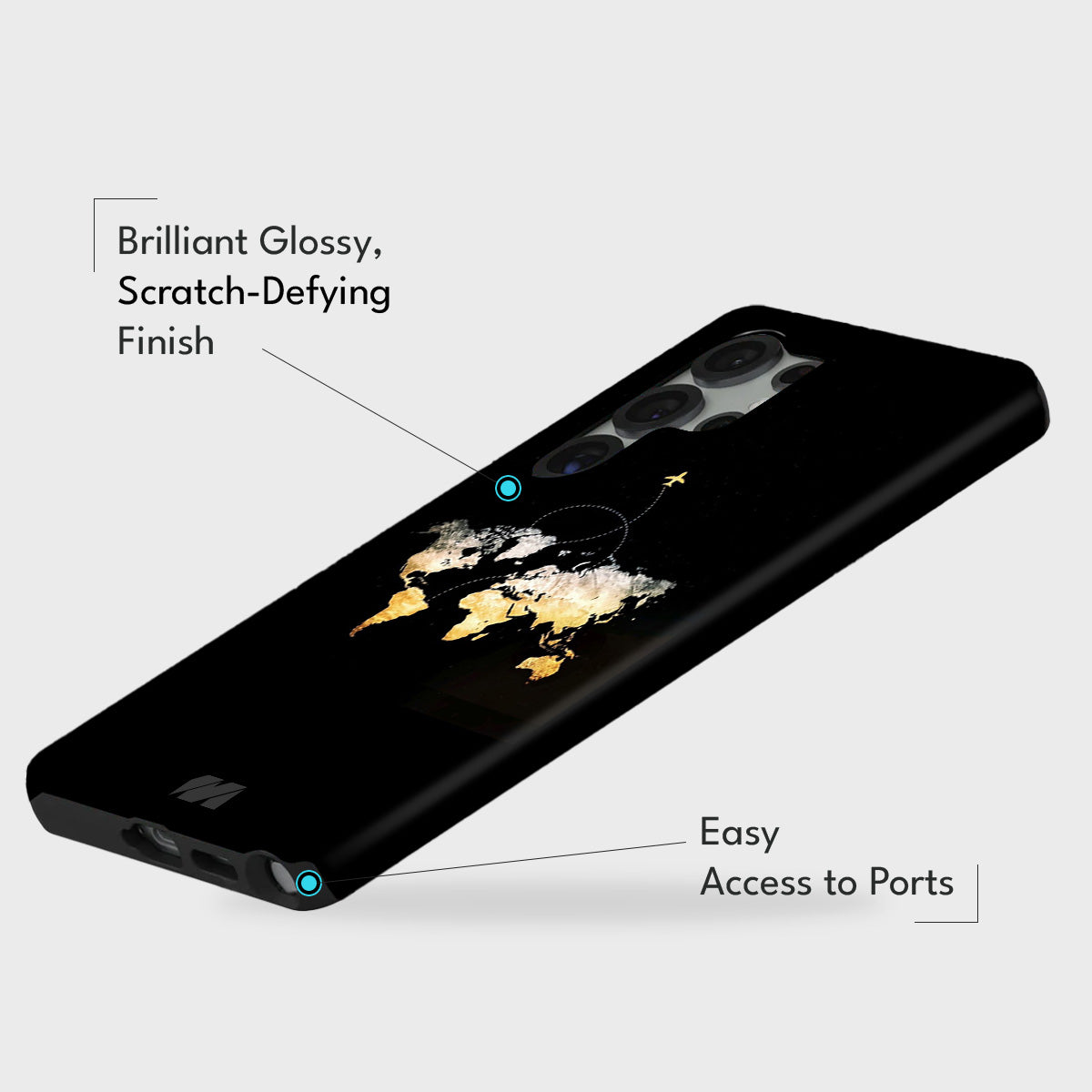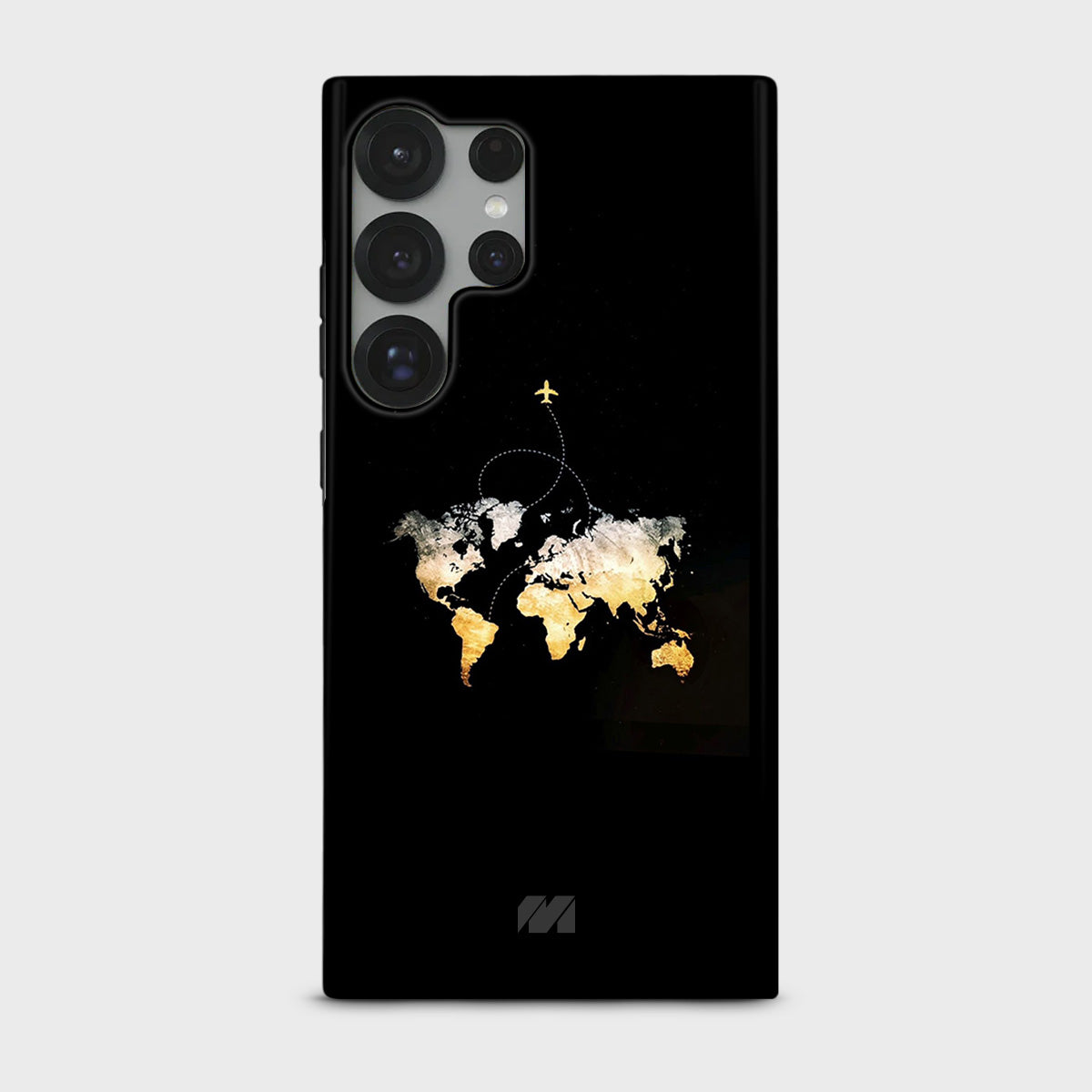 Set your spirit free and carry the world with you. The Planet Journey case features a stunning gold-accented world map with a soaring airplane silhouette, symbolizing freedom, ambition, and endless exploration.The deep black background highlights the glowing continents, creating a classy, travel-inspired aesthetic that stands out effortlessly.