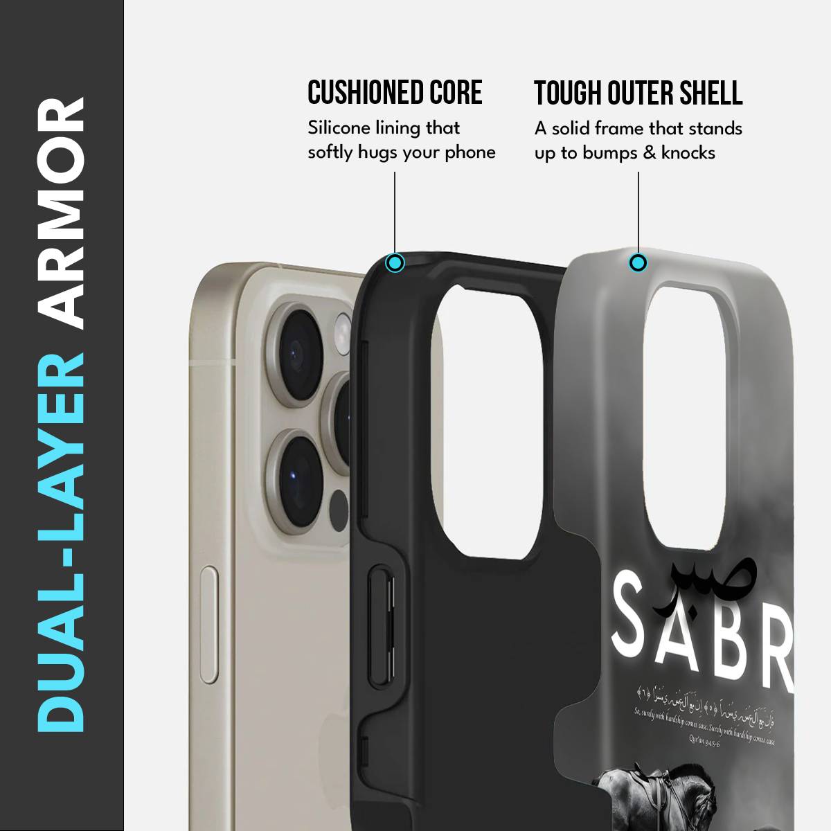 Embody patience, resilience, and unwavering faith with the Sabr Strength Case. Designed in calming monochrome tones, this case features a powerful scene of humility and endurance—a man in prostration beside his loyal horse, accompanied by the Arabic word Sabr and its Quranic reminder.