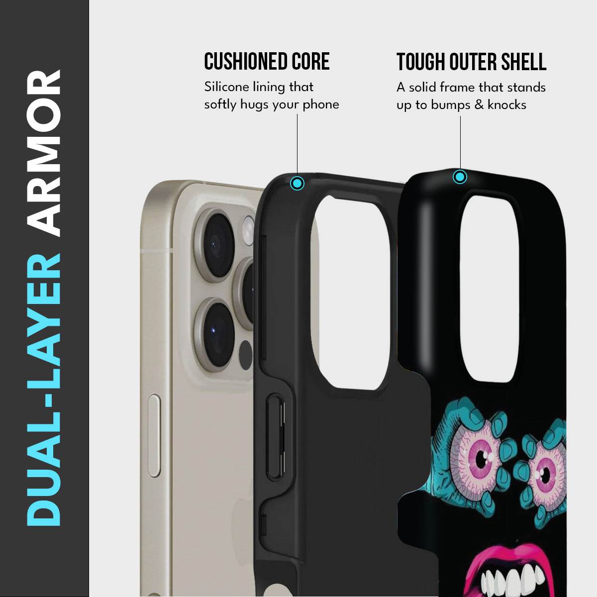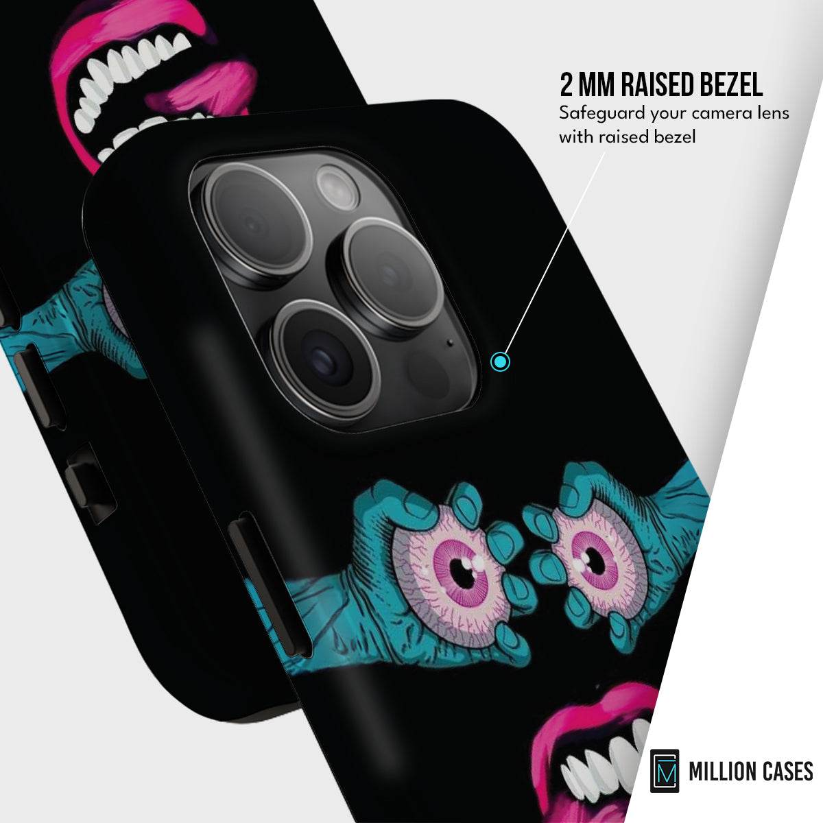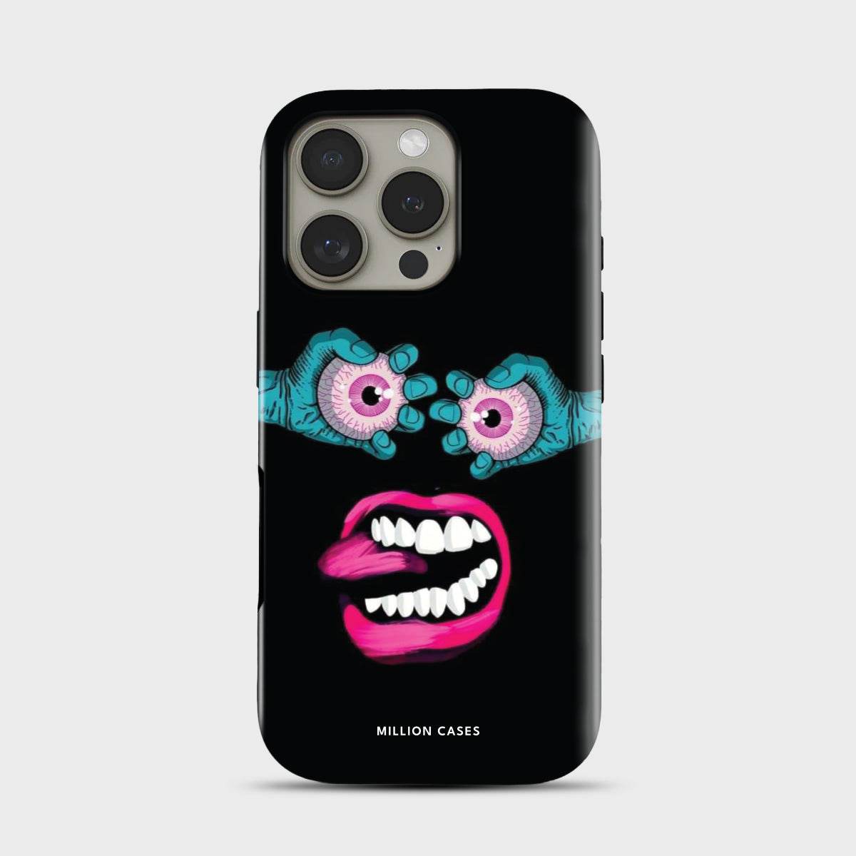 Unleash your wild side with Tongue Terror — a bold, brain-bending design that dares to stare back. With electric blue hands gripping bloodshot pink eyes and a screaming mouth flashing a twisted tongue, this case is pure chaotic energy. It's weird, it's wild, and it's impossible to ignore.